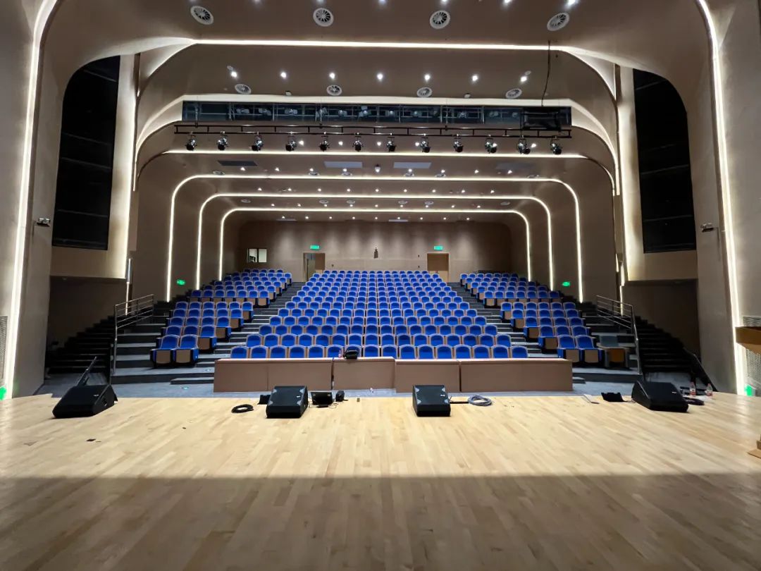 舞臺左右各2只15寸全頻音箱FR-X15aHQ增強了聲音的空間立體感,提供全場主擴聲。舞臺中央吊掛暗裝于臺口上聲橋內,中置共2只12寸全頻音箱FR-X12aHQ,彌補了左右主擴音箱投射方向的不足,使全場聲壓級分布均勻。