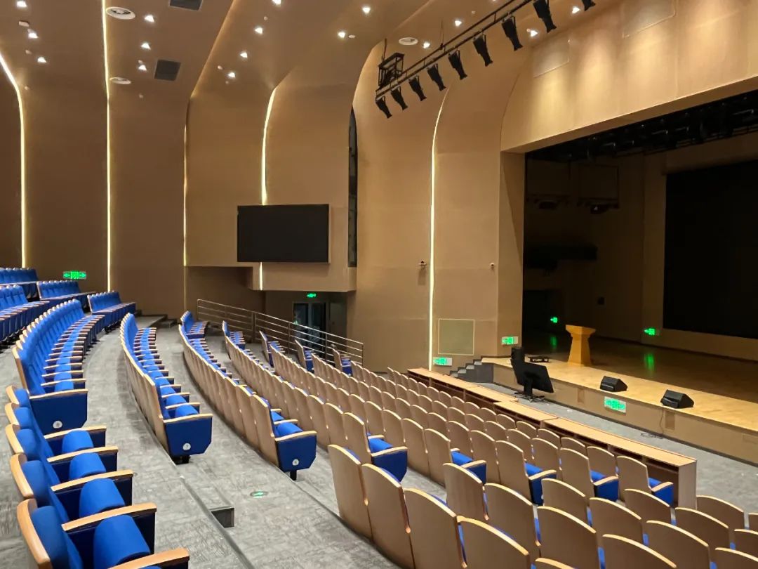 音箱的安裝位置和聲輻射方向,保證了觀眾席中各處有合適的響度、均勻度、清晰度和豐滿度,在觀眾和講臺的后墻,適當吸聲處理,減少后部反射聲,天花和側墻則作為反射面處理,用配置擴散結構進行聲折射和擴散,以增強早期反射聲,提高語言清晰度、使聲場分布均勻,同時利用天花頂和側墻后的空間設置低頻吸聲結構,減少低頻混響時間。