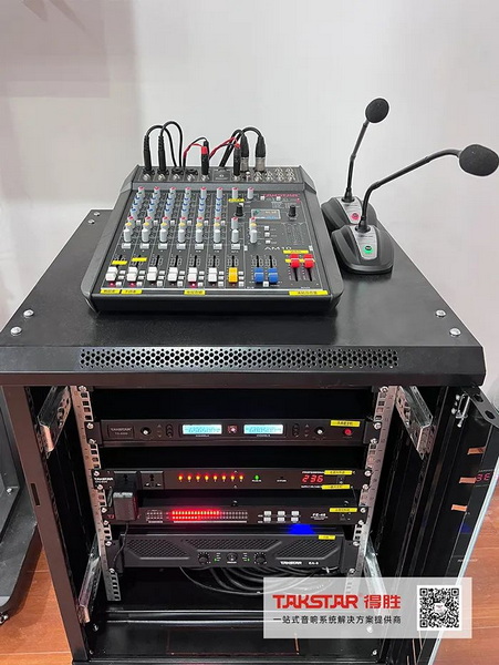 根據(jù)會議室結(jié)構(gòu)及聲學(xué)原理,得勝(廣州)專業(yè)技術(shù)團(tuán)隊(duì)配置了TK-110音箱搭配EA-3專業(yè)功放為擴(kuò)聲設(shè)備,拾音設(shè)備選用TS-8999TT無線麥克風(fēng),配合AM-10模擬調(diào)音臺、EPO-802N電源時(shí)序器等音頻設(shè)備,為會議活動提供清晰自然的語言擴(kuò)聲及穩(wěn)定的音效控制,使系統(tǒng)整體傳聲效果更契合室內(nèi)空間布局。