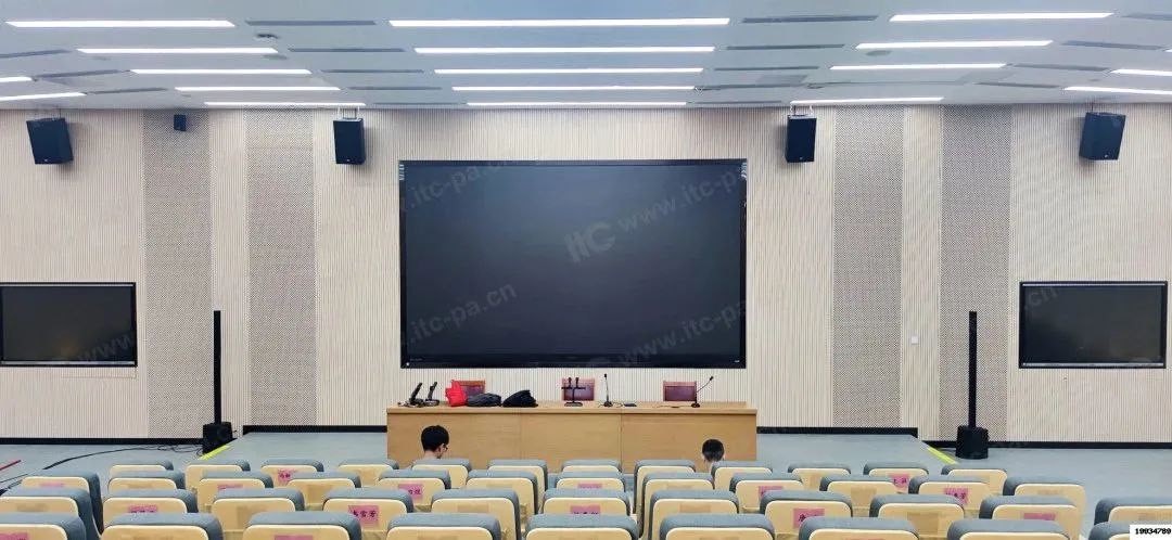 為解決上述問題,itc通過計算報告廳的音響場地系數進行設計,將4只350W輔助音箱、2只400W落地組合式音箱合理分布于報告廳場所,降低聲反饋概率,提高傳聲增益,解決嘯叫難題,保證報告廳每個角落的聲場聽覺均勻,具備良好的指向性控制,打造出卓越的擴聲體驗。