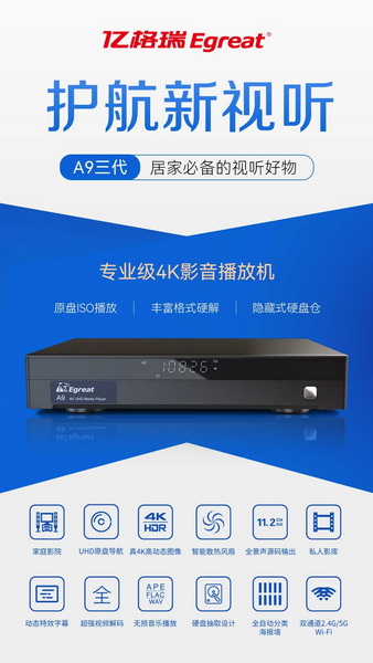 億格瑞藍(lán)光導(dǎo)航播放器的系列產(chǎn)品,曾多次在《家庭影院技術(shù)》與影音中國測評中表現(xiàn)優(yōu)異。畫質(zhì)通透、音質(zhì)飽滿、操控順滑,在用戶的家庭影音娛樂生活中性能穩(wěn)定,深受信賴!獨(dú)特功能優(yōu)勢包括:家庭影院UHD原盤導(dǎo)航、私人影庫、全自動分類海報墻、4K高動態(tài)圖像,強(qiáng)視頻解碼和無損音樂播放,自定義LED顯示屏,動態(tài)特效字幕等等,為用戶高清還原影音精彩!