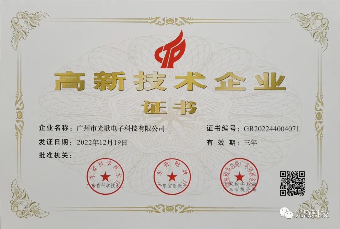 廣州市光歌電子科技有限公司于2022年12月19日被全國(guó)高新技術(shù)企業(yè)認(rèn)定管理工作領(lǐng)導(dǎo)小組辦公室認(rèn)定為“高新技術(shù)企業(yè)”。