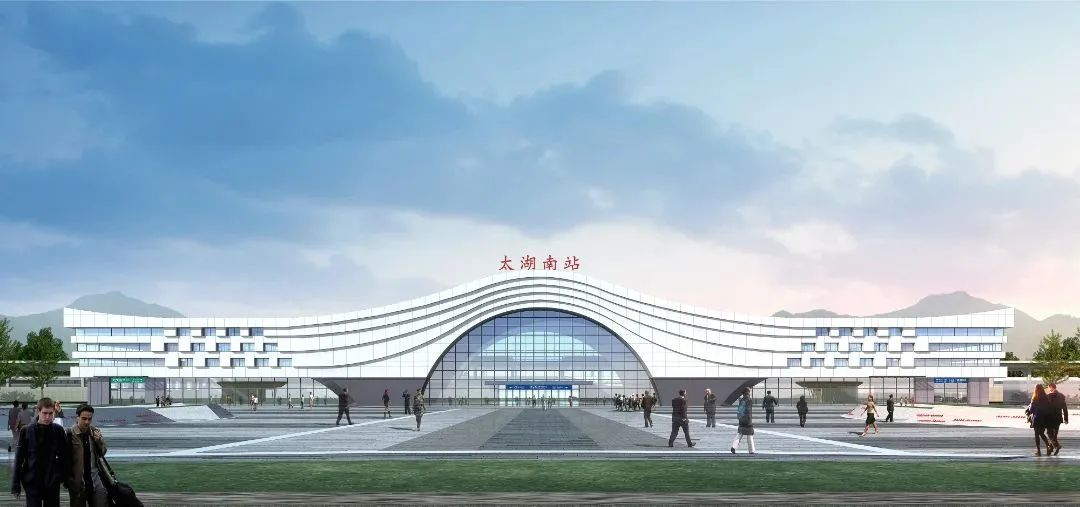 太湖南站,是安慶至九江高速鐵路的中間站點。在站房建筑立面設計中,以“日出平湖、禪宗圓相”為理念,抽象應用類似湖面的柔美曲線與宛若日出的拱形入口作為外部框架,表現碧波蕩漾、日出平湖的形態及禪宗中圓相的意境。