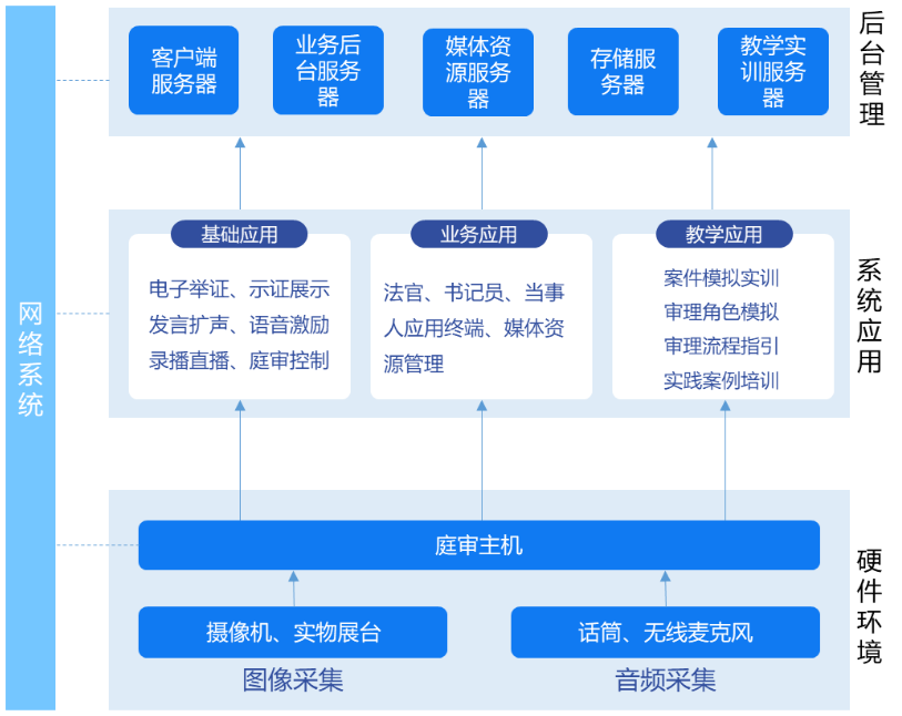 模擬法庭信息化建設主要包括硬件環(huán)境建設、系統(tǒng)應用軟件、后臺管理等系統(tǒng)建設。同時,還涉及法庭信息化應用、法庭信息化保障及管理等相關內容。