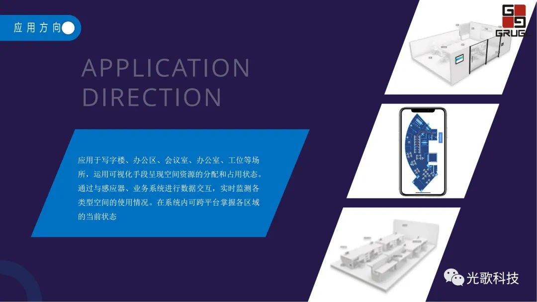 應用方向:應用于寫字樓、辦公區、會議室、辦公室、工位等場所,運用可視化手段呈現空間資源的分配和占用狀態。通過與感應器、業務系統進行數據交互,實時監測各類型空間的使用情況。在系統內可跨平臺掌握各區域的當前狀態。
