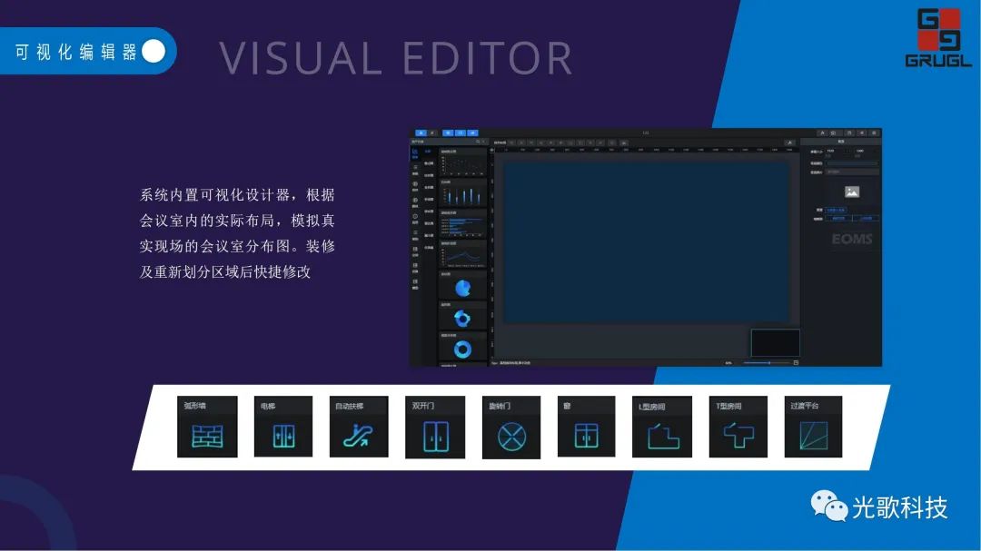 可視化編輯器:系統內置可視化設計器,根據會議室內的實際布局,模擬真實現場的會議室分布圖。裝修及重新劃分區域后快捷修改。