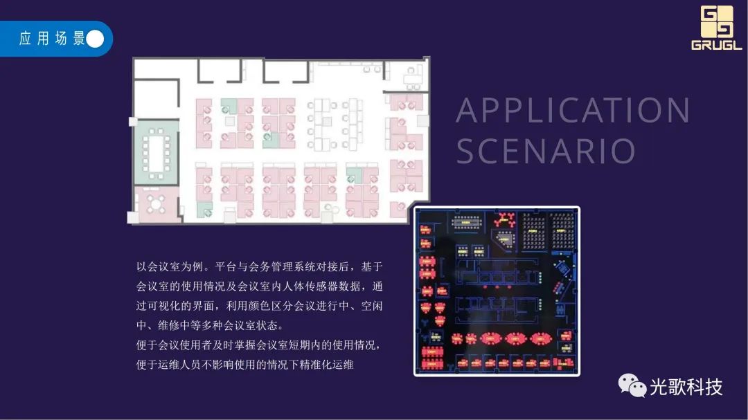 應用場景:以會議室為例。平臺與會務管理系統對接后,基于會議室的使用情況及會議室內人體傳感器數據,通過可視化的界面,利用顏色區分會議進行中、空閑中、維修中等多種會議室狀態。便于會議使用者及時掌握會議室短期內的使用情況,便于運維人員不影響使用的情況下精準化運維。