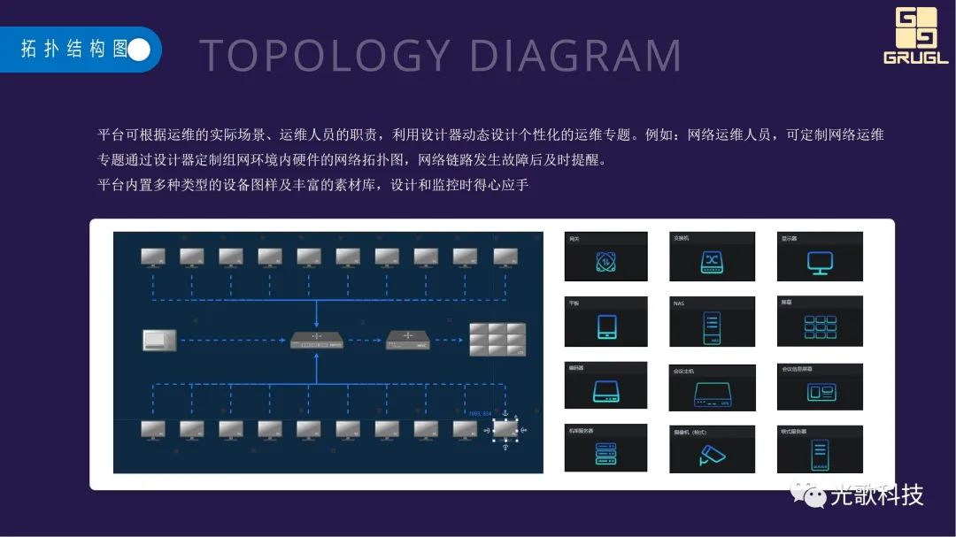 平臺可根據運維的實際場景、運維人員的職責,利用設計器動態設計個性化的運維專題。例如:網絡運維人員,可定制網絡運維專題通過設計器定制組網環境內硬件的網絡拓撲圖,網絡鏈路發生故障后及時提醒。平臺內置多種類型的設備圖樣及豐富的素材庫,設計和監控時得心應手。