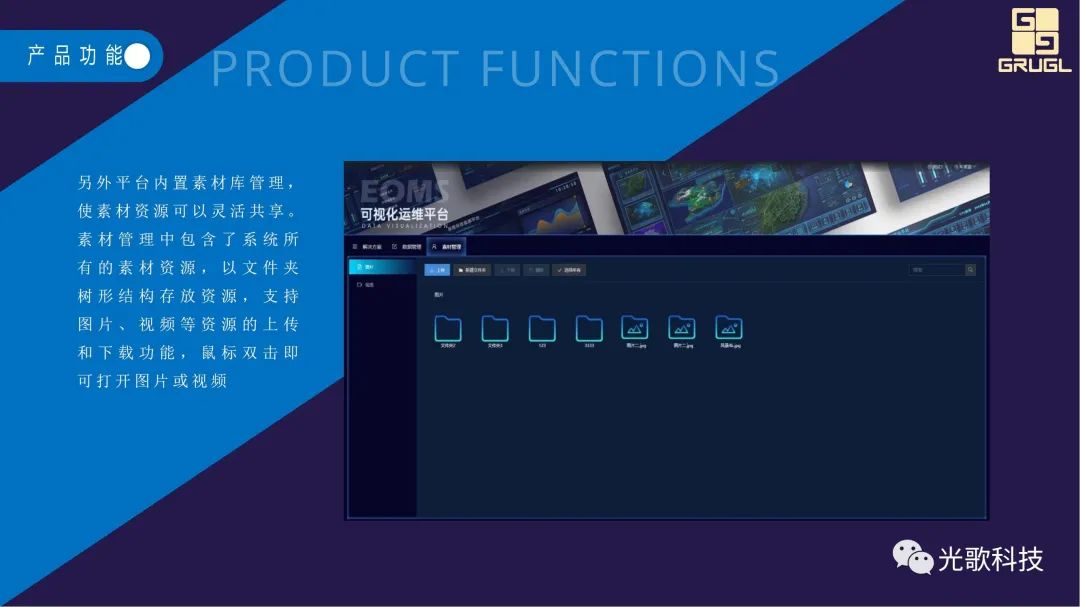 另外平臺內置素材庫管理,使素材資源可以靈活共享。素材管理中包含了系統所有的素材資源,以文件夾樹形結構存放資源,支持圖片、視頻等資源的上傳和下載功能,鼠標雙擊即可打開圖片或視頻。