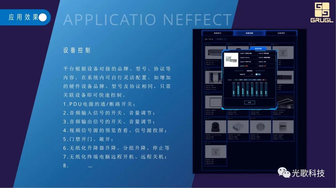 PDU電源的通/斷路開關;音頻輸入信號的開關、音量調節;音頻輸出信號的開關、音量調節;視頻信號源的預覽查看、信號源投屏;門禁開門、敞開;無紙化升降器升降、分組升降、停止等;無紙化終端電腦遠程開機、遠程關機;