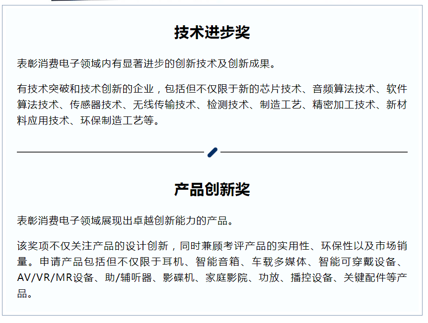 4、官方平臺曝光:包括但不僅于在中國國際音頻產業大會官方平臺上,給予獲獎產品更多曝光機會5、行業標準制定:有機會被邀請參與制定或修訂行業標準,影響行業發展方向