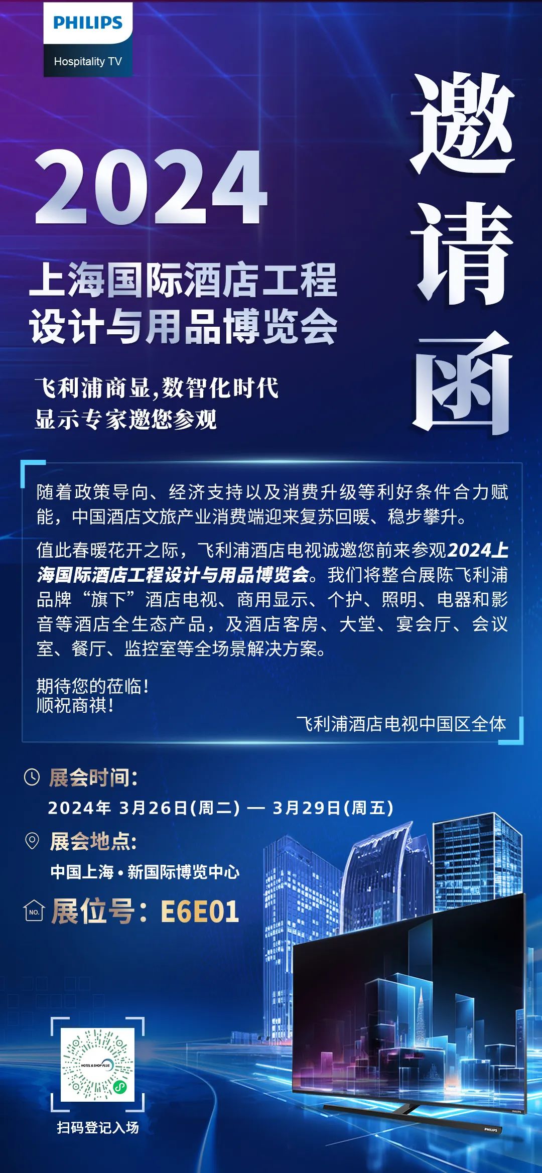 2024年3月26日-29日,深耕酒店及商業空間領域30余載的行業大展——2024上海國際酒店工程設計與用品博覽會將于上海新國際博覽中心召開。飛利浦酒店電視品牌將攜酒店全生態產品及酒店全場景解決方案重磅亮相,以數字化、智能化的創新產品及前沿應用,一展智慧酒店品牌建設成果。同時,將召開飛利浦酒店電視2024年全國合作伙伴大會,與一眾合作伙伴共謀商業合作新模式。