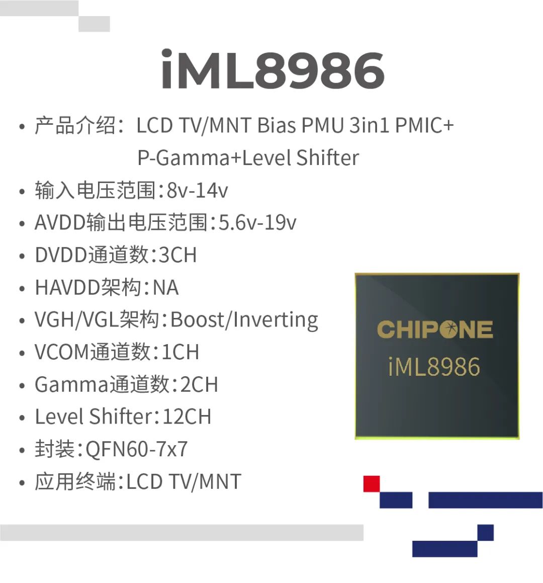 作為集創北方在顯示電源管理芯片領域的重要產品之一,iML8986是一顆具有高度整合性的電源管理IC,該產品可用于TFT、LCD面板,能夠完美適配各品牌中高端顯示器、TV等顯示應用產品。iML8986具有優異的靜態電流消耗管理能力以及高效率的電源輸出,能夠提升顯示器設備在各種應用負載下的功耗表現以及系統整體的運行效率,且該產品更容易通過各國各地區的節能減排規范要求;高質量低波紋的電源輸出能夠給面板提供更加穩定的畫面;彈性廣闊的SR調整能夠有效的避免系統電磁干擾問題。