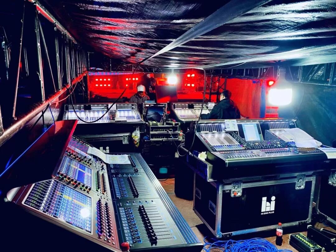 PA和monitor均采用兩張DiGiCo SD7 Quantum、一張SD5 Quantum,PA采用一張Quantum 225作終混臺(tái),monitor則為一張Quantum 338。三個(gè)系統(tǒng)互不影響,可以讓調(diào)音師在樂隊(duì)轉(zhuǎn)場(chǎng)時(shí)做好充分準(zhǔn)備。由于晚上彩排時(shí)不能造成噪聲擾民,何老師特意安排在每一張PA調(diào)音臺(tái)都取了相應(yīng)L-ISA處理器的下變換雙耳渲染信號(hào),讓調(diào)音師用耳機(jī)也能感受到沉浸式系統(tǒng)的調(diào)試效果。