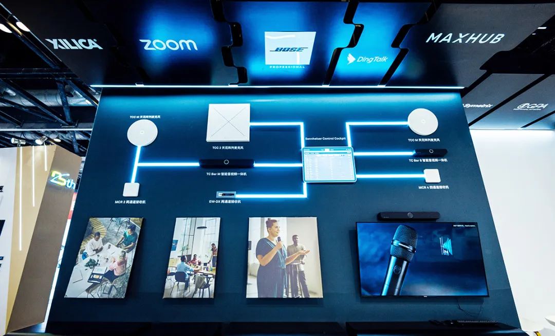 在展臺的核心區域,森海塞爾通過拓撲圖的形式,直觀且生動地展示了森海塞爾音頻解決方案的完整生態系統:通過TCC 2和TCC M天花陣列麥克風來滿足不同規模的會議空間需求,以TC Bars智能音視頻一體機為核心進行信號處理和交換。該系統還可以無縫集成森海塞爾EW-DX無線數字麥克風系統和Speechline數字無線系列等產品。