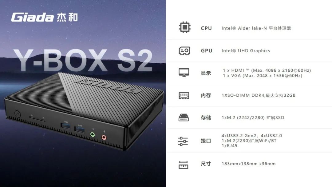 Y-BOX S2處理器平臺(tái)為Alder Lake-N,是英特爾首款采用7納米制程的產(chǎn)品系列。采用主流的DDR4內(nèi)存,支持 M.2和eMMC多存儲(chǔ)設(shè)備可選,M.2支持PCIE X2和SATA SSD,可滿足客戶對(duì)高數(shù)據(jù)讀寫的需求,最大支持32GB;具備一個(gè)HDMI接口和一個(gè)VGA接口,可以連接到顯示器、電視及投影儀,HDMI接口支持最高分辨率為4096 x 2160@60Hz,VGA接口支持最高分辨率為2048 x 1536@60Hz。