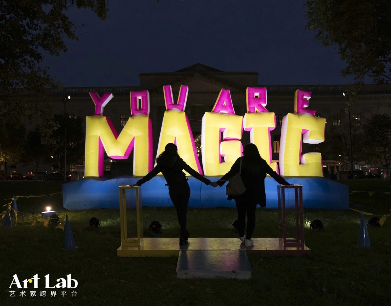 雕塑充滿了空氣,參與者手拉手的時間越長,雕塑就越大,越亮,延伸出“你是魔法”的字樣。他們一松開手,電路就斷了,雕塑就癟成了地上一堆皺巴巴的織物。