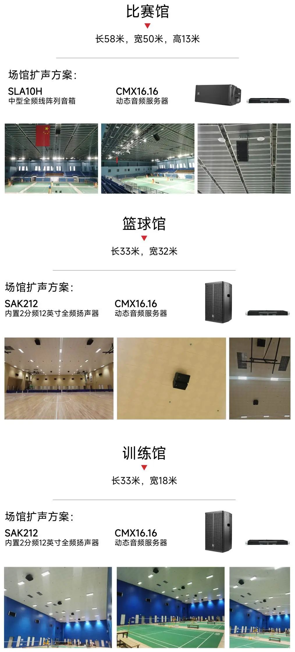 我們根據其建筑結構特點和功能需求設計頂部吊裝點聲源揚聲器,其中訓練館8只SAK212,籃球館16只SAK212全頻音箱。