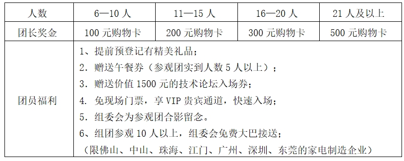 10人以上組團(tuán)參觀,組委會(huì)提供免費(fèi)大巴車接送;歡迎家電·智能家電·智能家居制造企業(yè)組團(tuán)免費(fèi)參觀洽談: