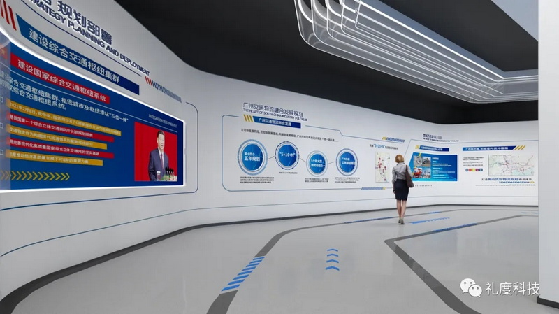 結合火車元素的流線展板,通過發(fā)光燈帶和圖文/燈箱的方式,展示國家政策趨勢要求、宏觀戰(zhàn)略規(guī)劃部署、廣州交通物流融合發(fā)展規(guī)劃;