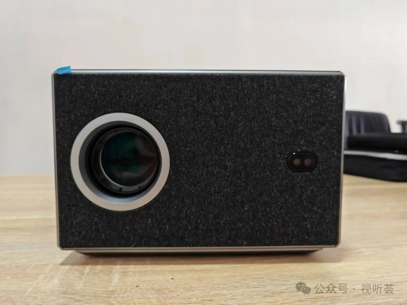 首先,從外觀上來看。這一款智能微投采用的是經典的銀色外觀,十分具有質感。在鏡頭所在正面,采用的是蒙布工。值得一提的是,這一顆鏡頭采用的是漢王自研的“獵鷹”全封閉光機鏡頭,可以實現精準控光,讓光源更加集中,減少損耗。(我們在后面的畫面為大家展現),此外,在鏡頭配備了兩顆用于TOF自動對焦攝像頭。