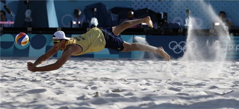 8月6日,巴西隊選手迭戈·馬里亞諾·蘭奇在比賽中救球。當日,在巴黎奧運會沙灘排球男子四分之一決賽中,瑞典隊2比0戰勝巴西隊,晉級半決賽。新華社記者 費茂華 攝