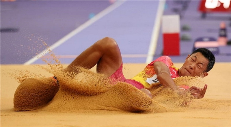 8月6日,中國選手王嘉男在比賽中。當日,巴黎奧運會田徑男子跳遠決賽在法蘭西體育場舉行。新華社記者 李明 攝