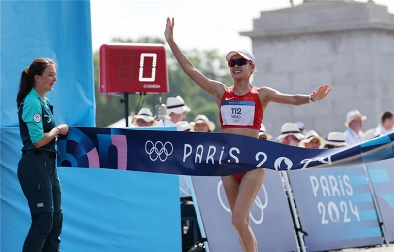 8月1日,楊家玉向終點沖刺。當日,在巴黎奧運會女子20公里競走比賽中,中國選手楊家玉奪得冠軍。新華社記者 李鋼 攝(裁切后)