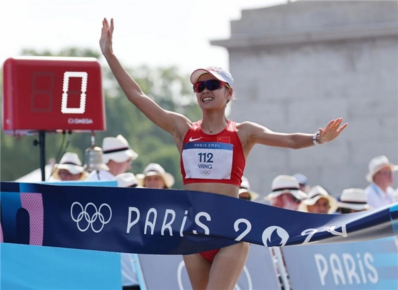 8月1日,楊家玉向終點沖刺。當日,在巴黎奧運會女子20公里競走比賽中,中國選手楊家玉奪得冠軍。新華社記者 李鋼 攝(裁切前)