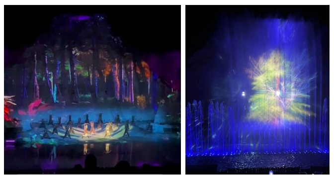 演出現場,演員與山體上的宏大投影(左側)以及水幕上的投影(右側)交相輝映,令觀眾如癡如醉
