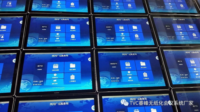 軟件。廣元市稅務局會議室設備采用55臺華為M5平板電腦、TVC睿峰無線動態投影主機、TVC睿峰專業會議服務器。會中批閱文件流暢迅速,同屏投影效果清晰,節省紙張消耗,大大提升了會議效率,獲得單位領導一致好評!